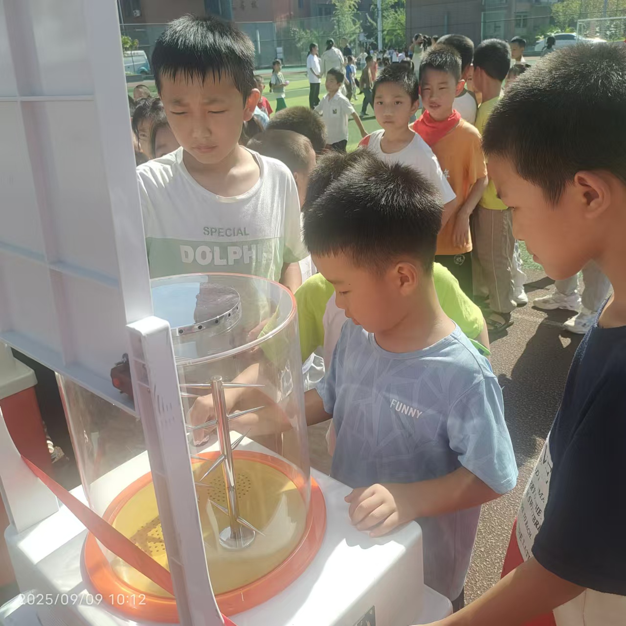 数辆科普大篷车充分发挥“流动科技馆”的作用,在学校操场开展科普展示与互动体验:大篷车装备“尖端放电”“旋转的银蛋”“翻转的镜像”“磁力传动摆”“锥体上滚”等24件互动展品,涵盖力学、电磁学、光学等多个学科领域知识。孩子们通过亲眼观察和亲手操作,直观理解科学原理。