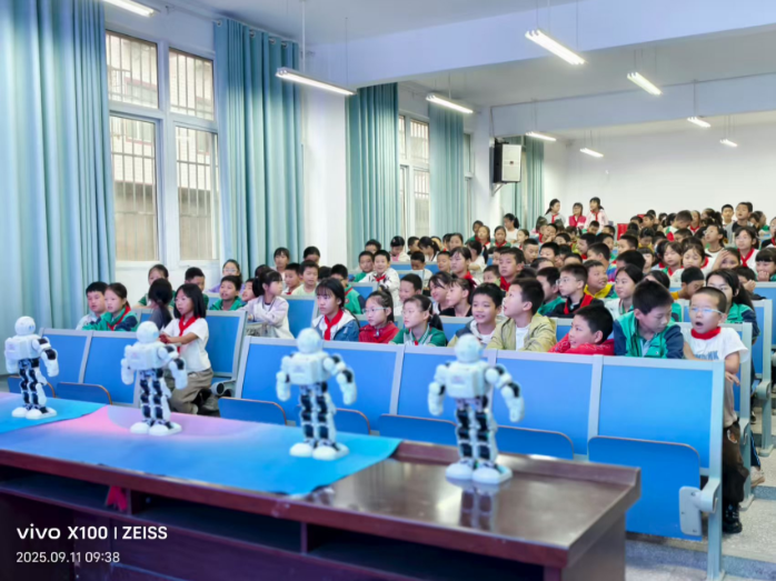 无人机编队在空中划出流畅轨迹,完成翻滚、悬停等高难度动作,引发现场阵阵惊叹;智能机器狗以灵活的步伐完成跳跃、翻滚等动作;学生和机器人进行人机对话……这都是人工智能技术的生动应用。五龙小学五年级二班何晨曦同学在观看机器人表演后说:“机器人太了不起了,我一定好好学习,将来长大了也要研究机器人。”