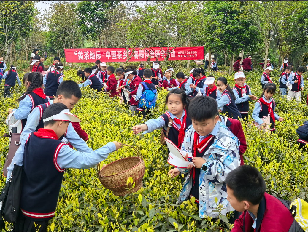 活动现场,茶园绿意盎然、层层叠叠,红色横幅“黄茶地标·中国茶乡’春假科普研学活动”格外醒目。学生们在基地工作人员引导下穿梭于茶树间,近距离观察黄茶茶树形态,聆听种植技术、生长周期讲解,认真记录笔记。部分学生化身“小小采茶师”,小心翼翼采摘鲜嫩茶芽,同伴间相互协作将茶叶装入竹篮,在农事实践中体验劳作乐趣。